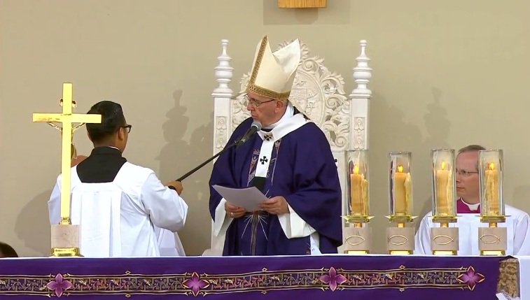 Es tiempo de conversión, es tiempo de salvación, es tiempo de misericordia. Por eso, digamos junto al sufrimiento de tantos rostros: «Por tu inmensa compasión y misericordia, Señor apiádate de nosotros… purifícanos de nuestros pecados y crea en nosotros un corazón puro, un espíritu nuevo» (cf. Sal 50/51,3.4.12). Y también deseo en este momento saludar desde aquí a nuestros queridos hermanos y hermanas que nos acompañan simultáneamente al otro lado de la frontera, en especial a aquellos que se han congregado en el estadio de la Universidad del Paso conocido como el Sun Bowl. Bajo la guía de su Obispo, Mons. Mark Seitz. Gracias a la ayuda de la tecnología podemos orar, cantar y celebrar juntos ese amor misericordioso que el Señor nos da y que ninguna frontera podrá impedirnos compartir, Gracias hermanos y hermanas, gracias hermanos y hermanas de El Paso por hacernos sentir una misma familia y una misma comunidad cristiana.